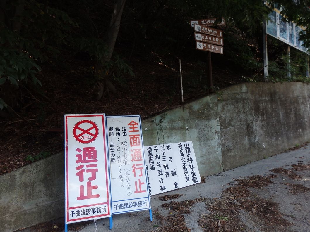 橋を渡り、さあ上ろうとしたが、そこには通行止めの看板が・・・。