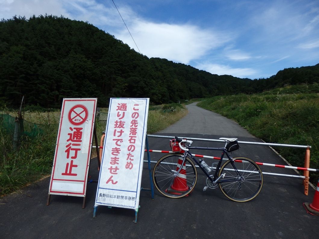 下りきると千曲川を渡ることになるが、堤防上にサイクリングロードがあったので、とりあえず行ってみることにした。聖湖に向かうと、やはり落石があったが、確かに軽自動車は通れる。