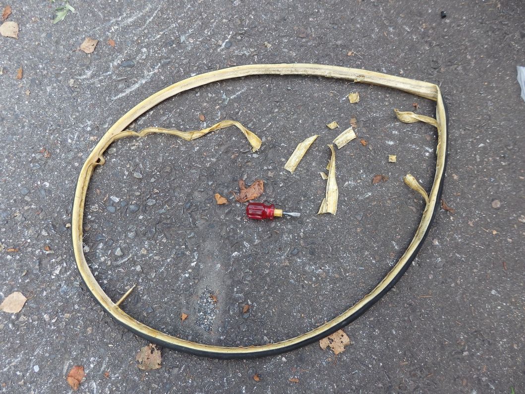 このタイヤ、一度パンクして剥がし修理したものなので、ふんどしが劣化してタイヤに残ってしまい、すべて剥がすのに難儀した。