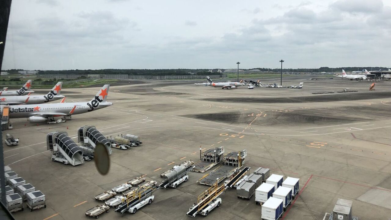 ジェットスターの向こうがJAL、さらに向こうがANA。
