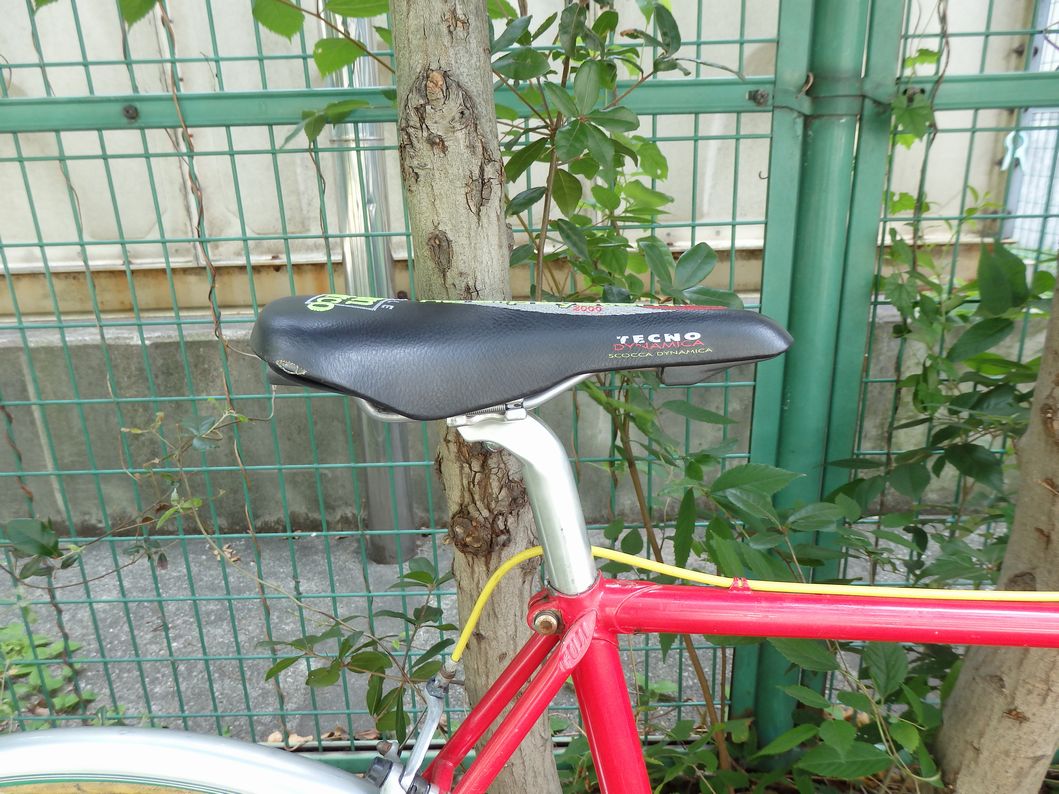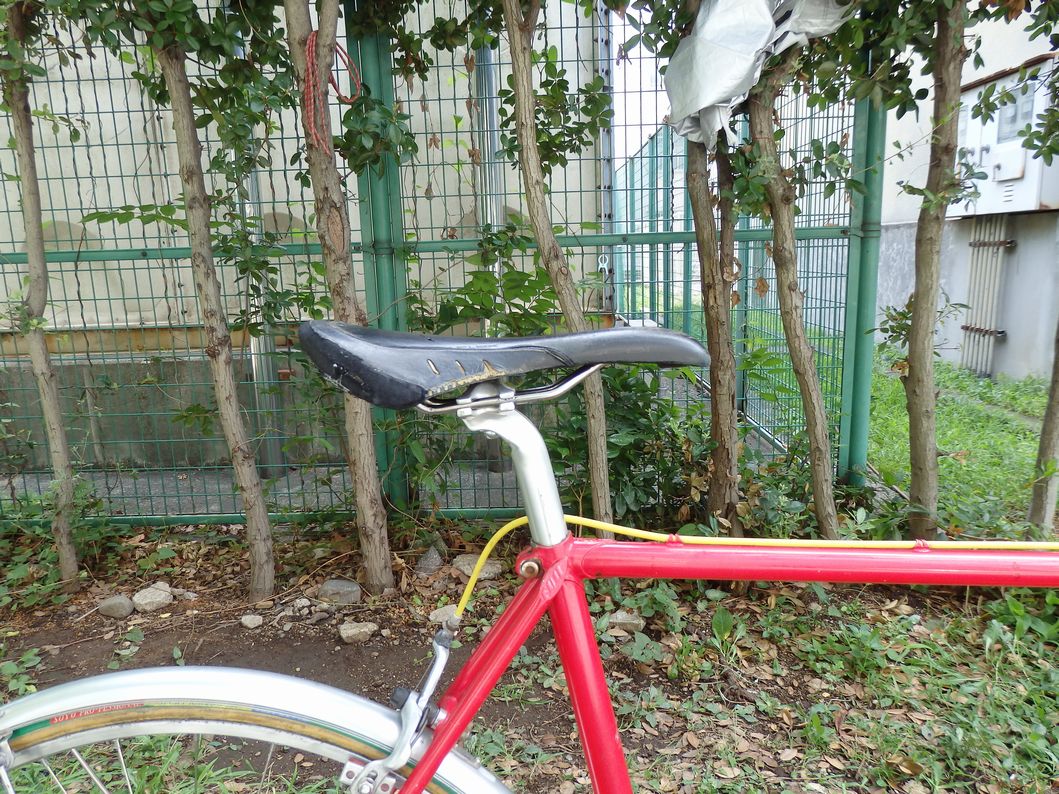 バーテープはもはや黄色でないし、タイヤも前後でアンバランス。サドルもボロボロ。