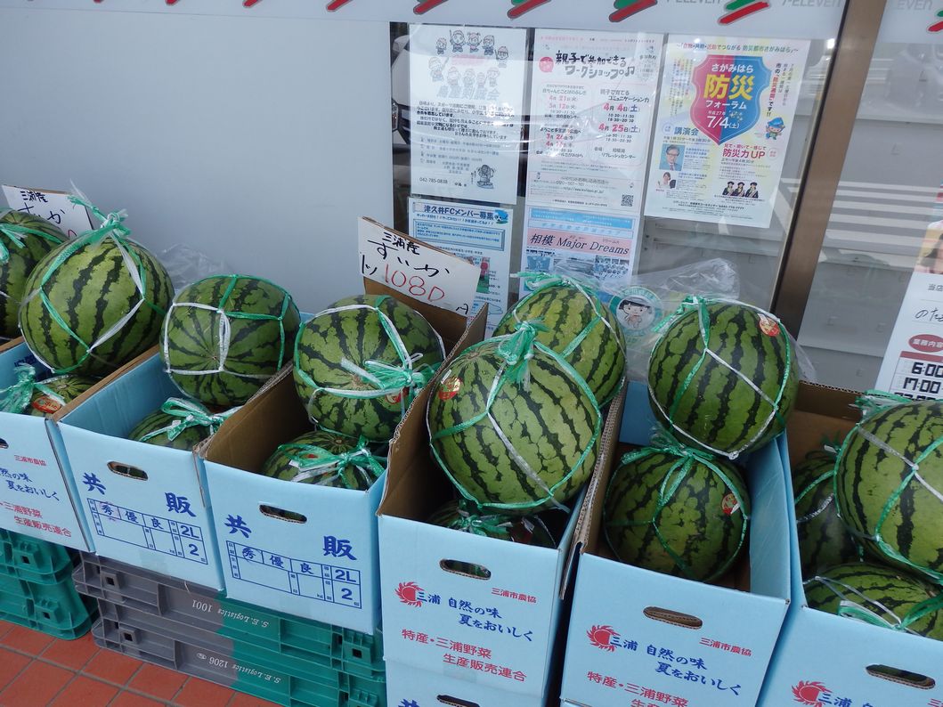セブンイレブンの前には、三浦産のスイカが1080円で売られていた。