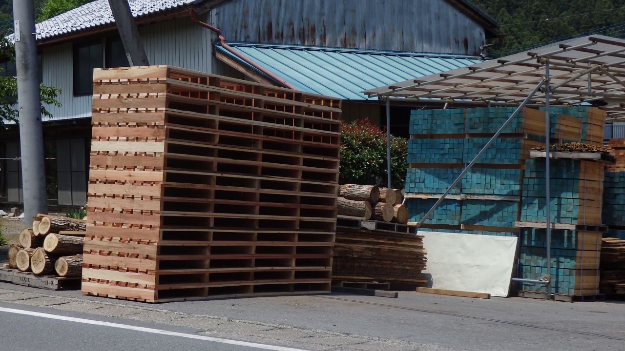 道沿いの製材工場には、表にパレットが積まれていた。天日乾燥かな。