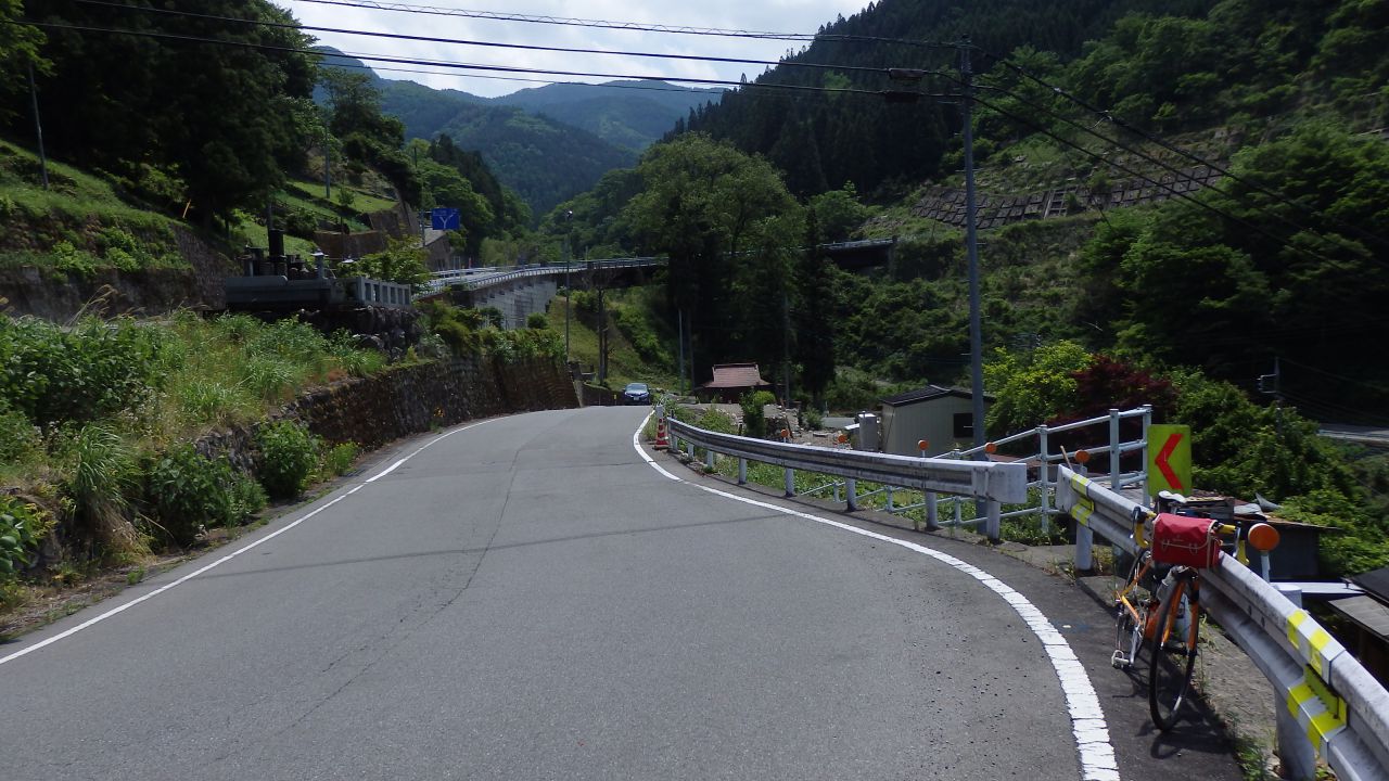 湯ノ沢トンネルに向かう道が谷を跨いで右に向かっている。