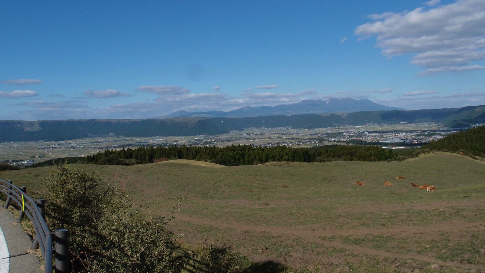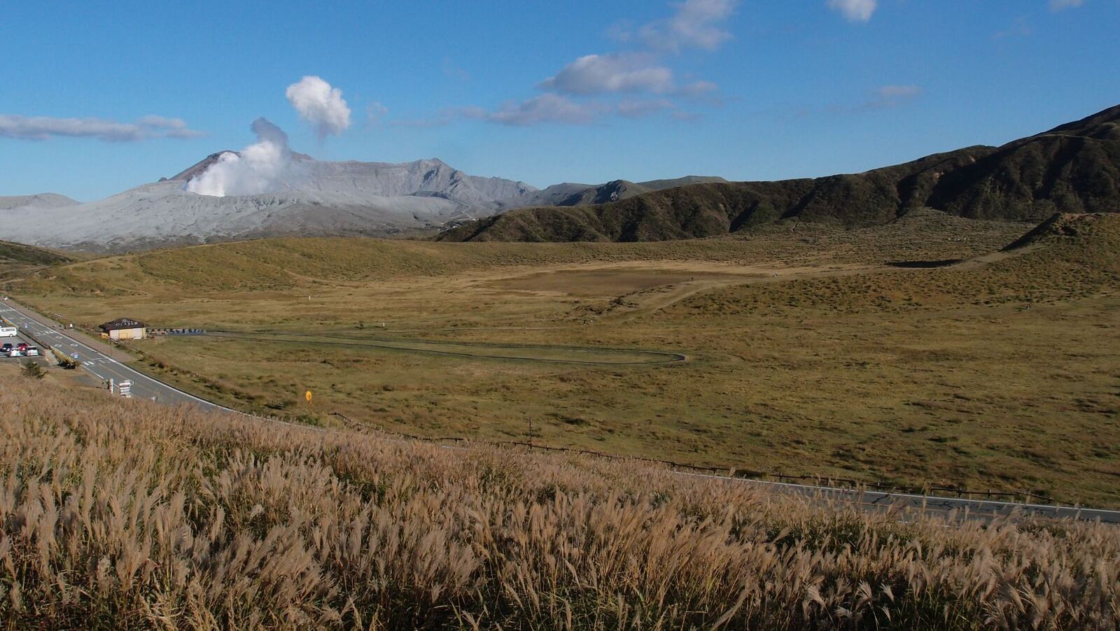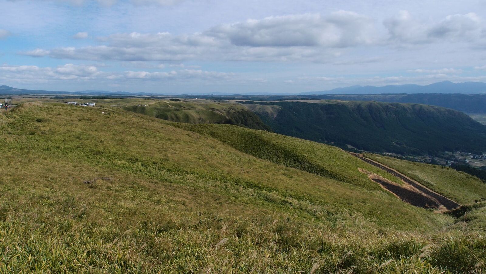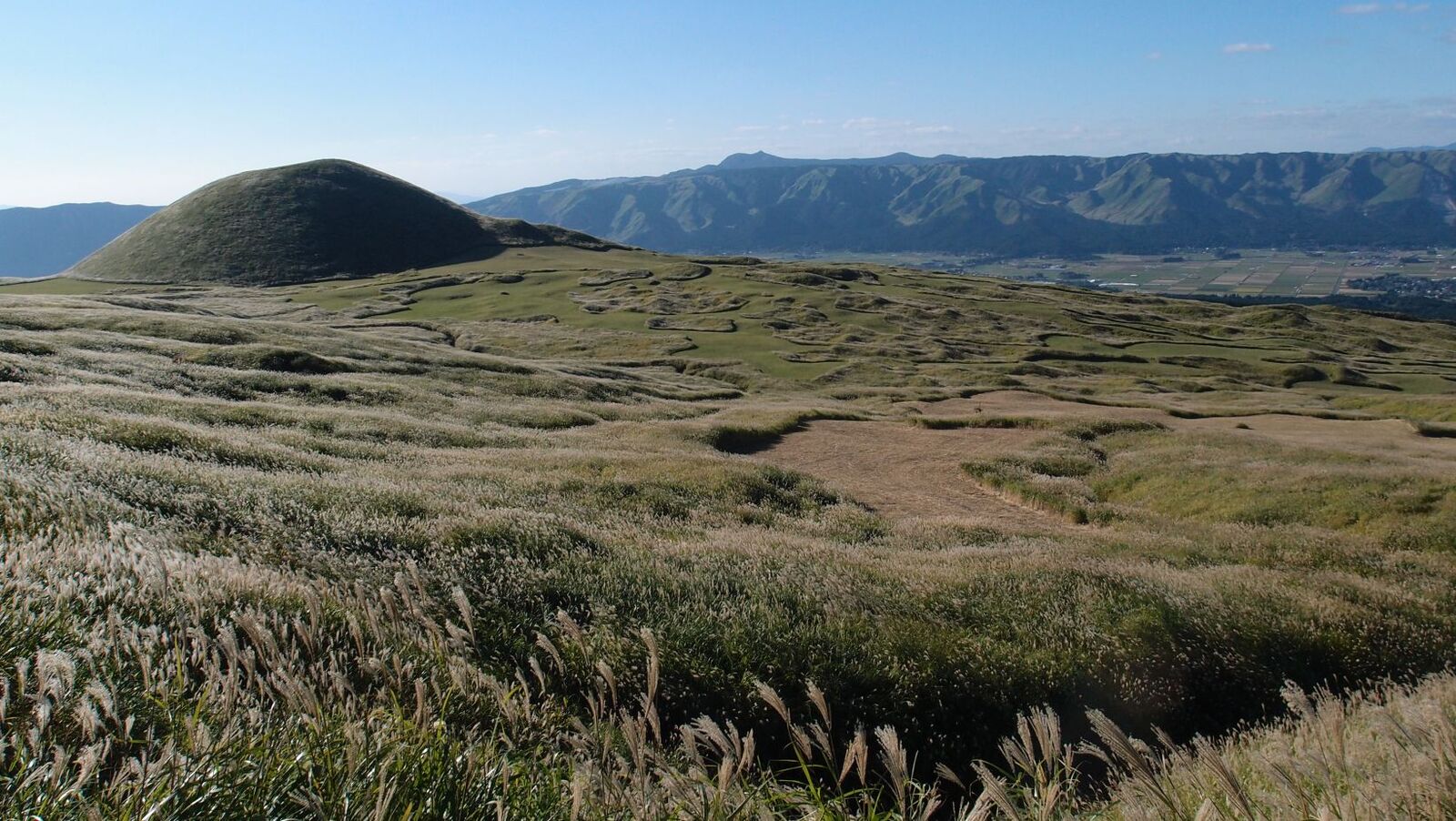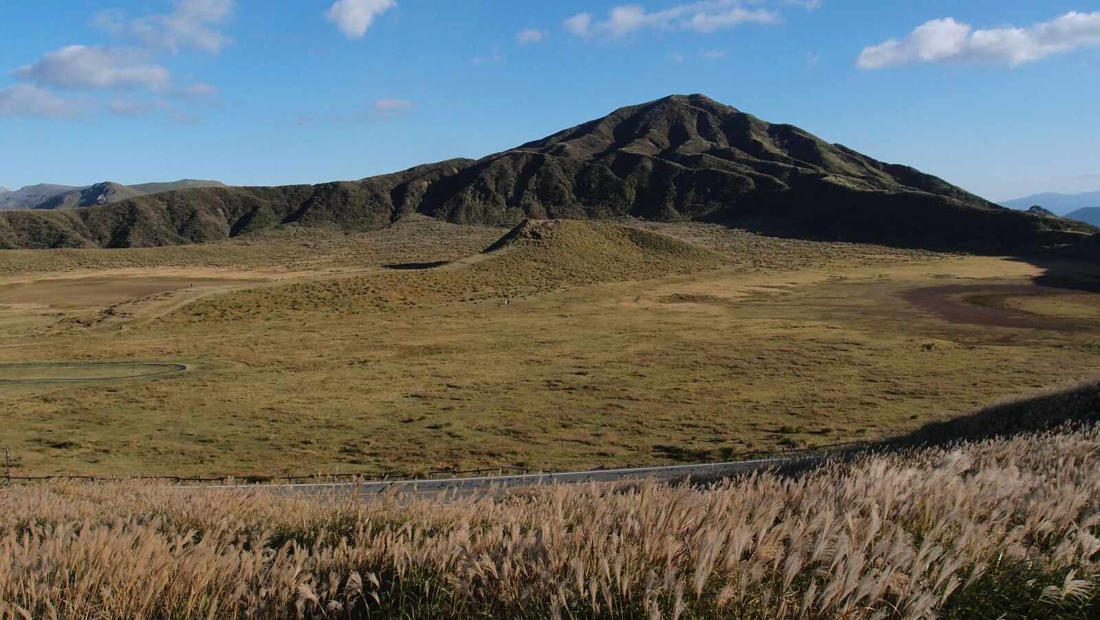 阿蘇山の阿蘇五岳の一部が草原の向こうに頭を出している。