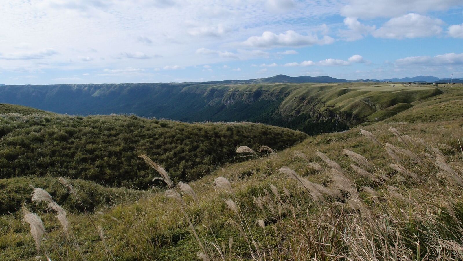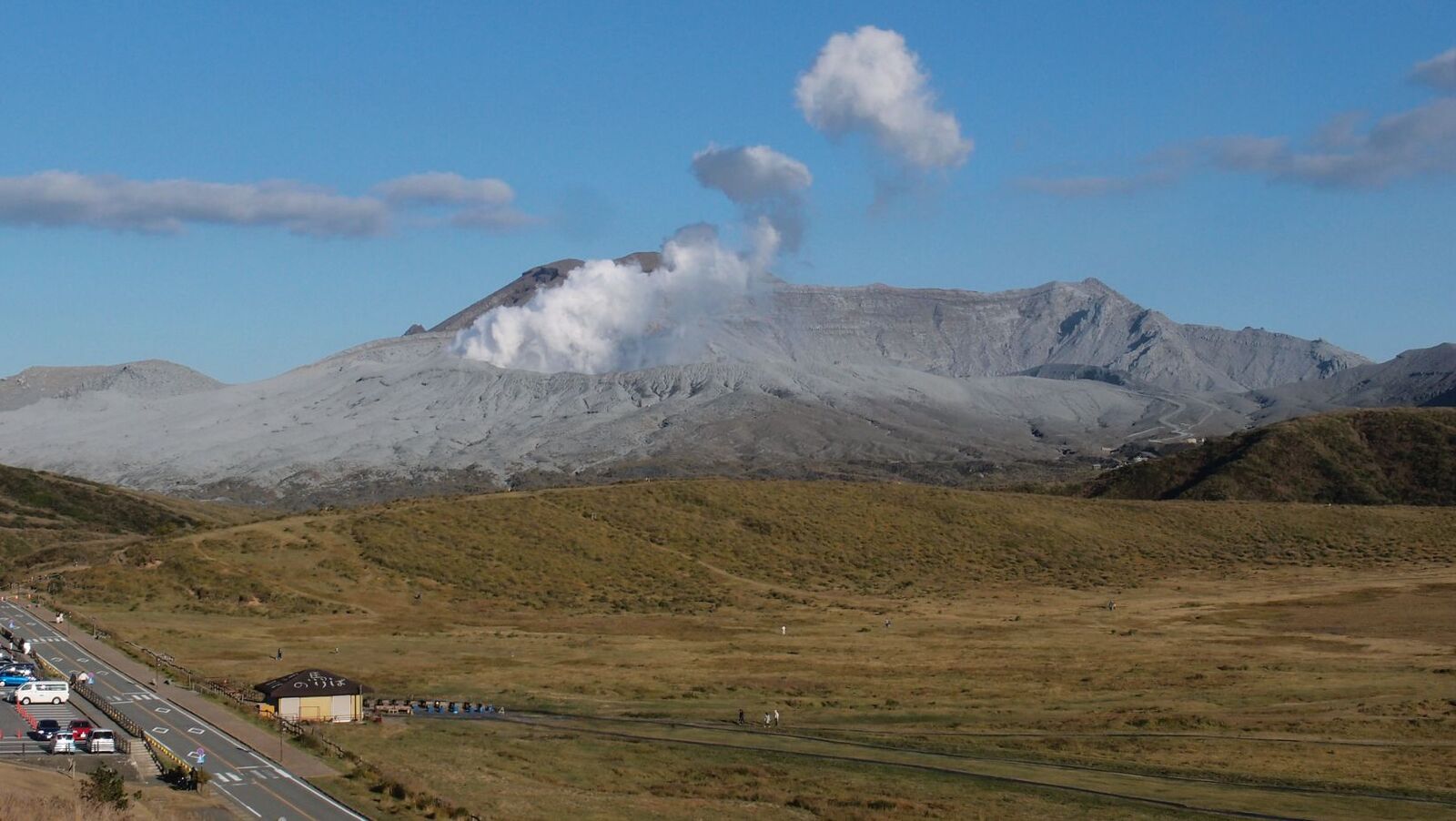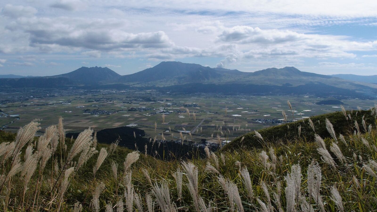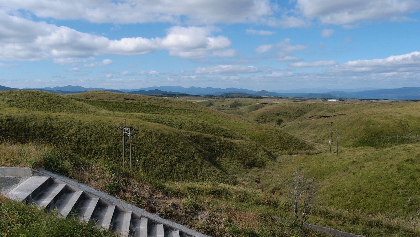 阿蘇山の阿蘇五岳の一部が草原の向こうに頭を出している。