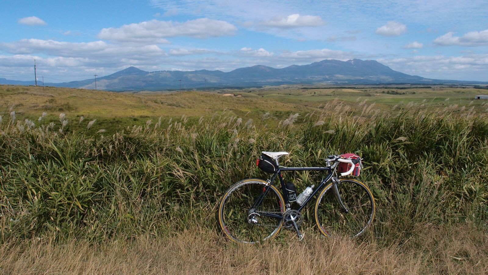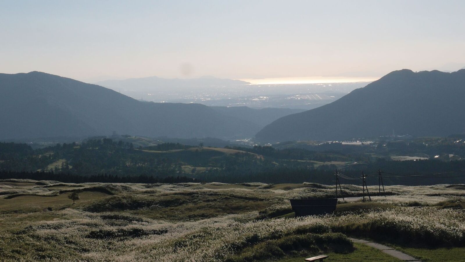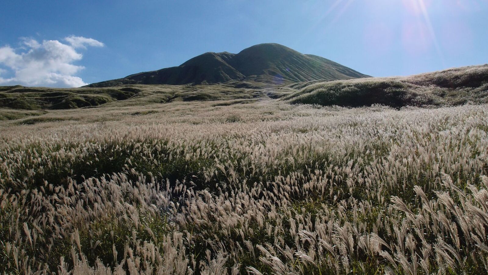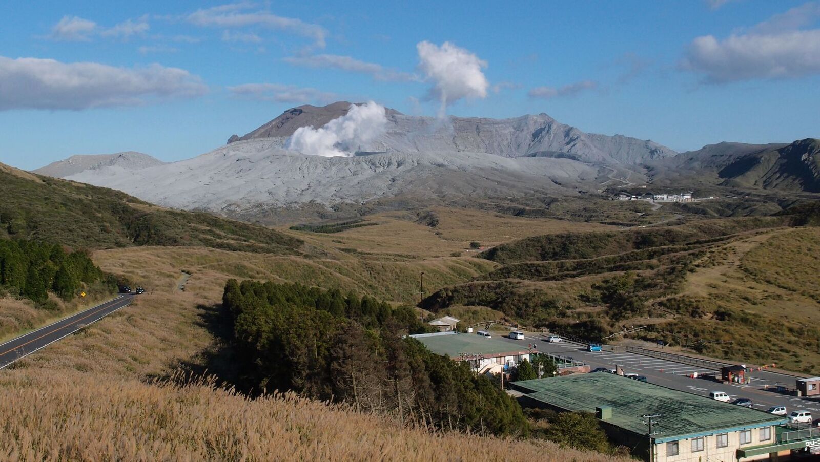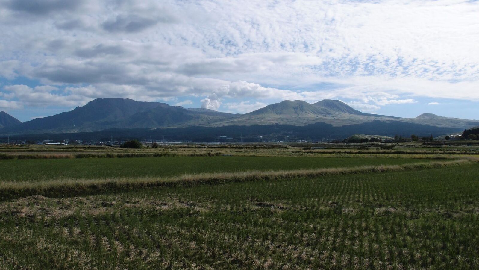 阿蘇山の阿蘇五岳の一部が草原の向こうに頭を出している。