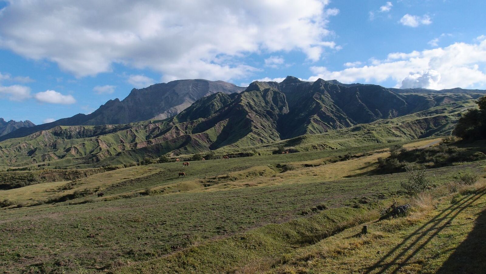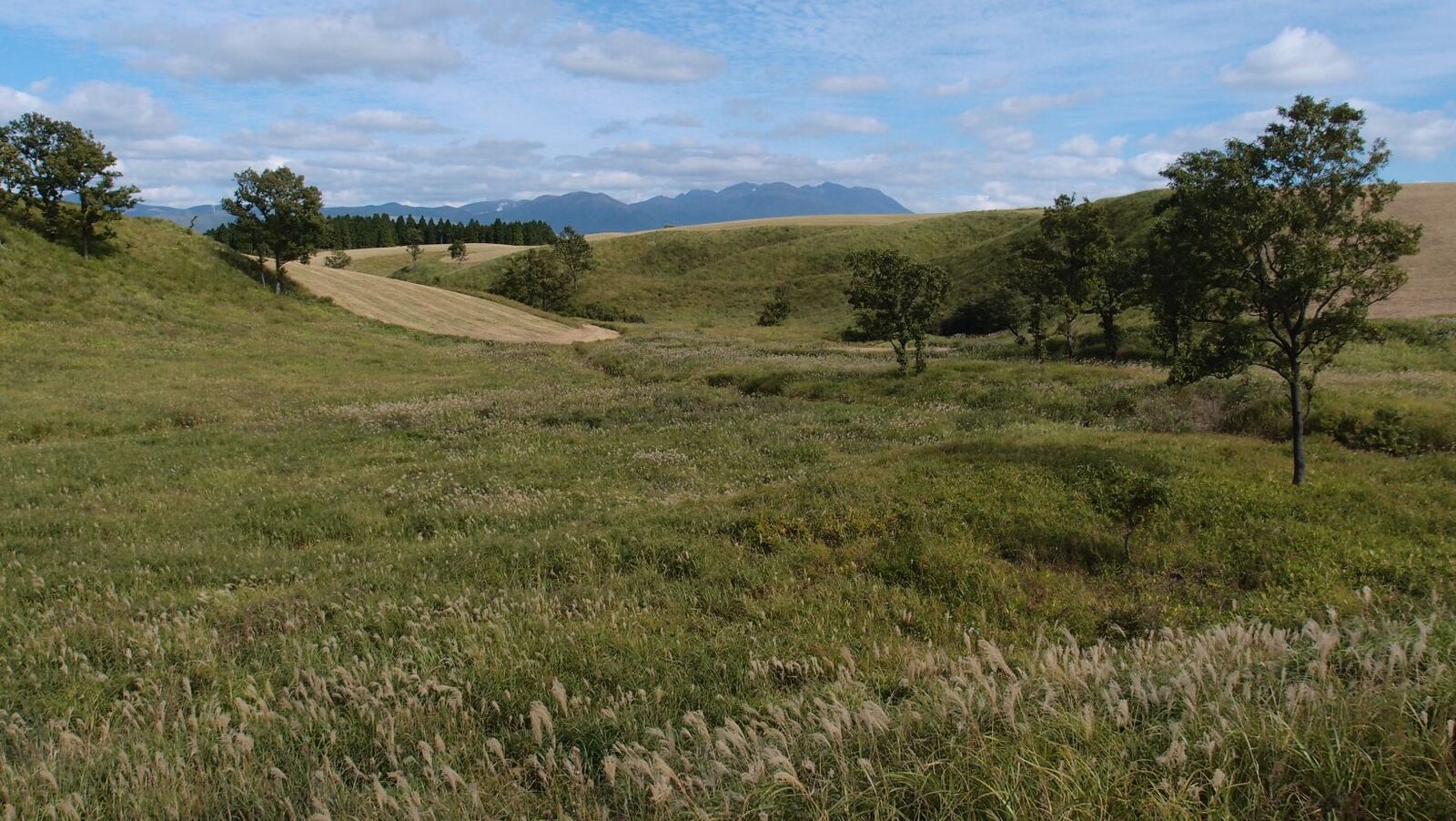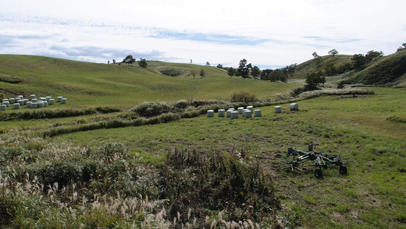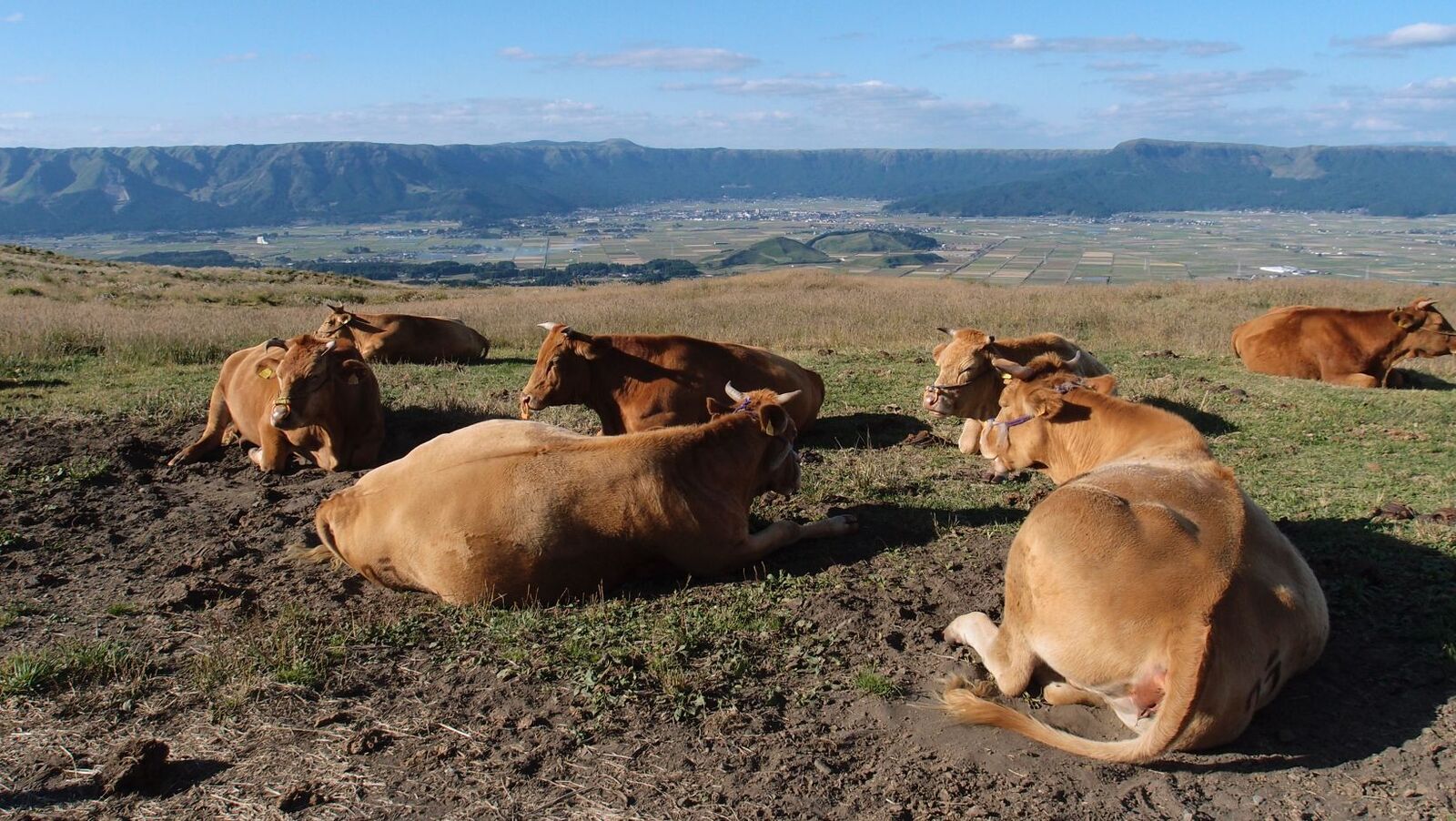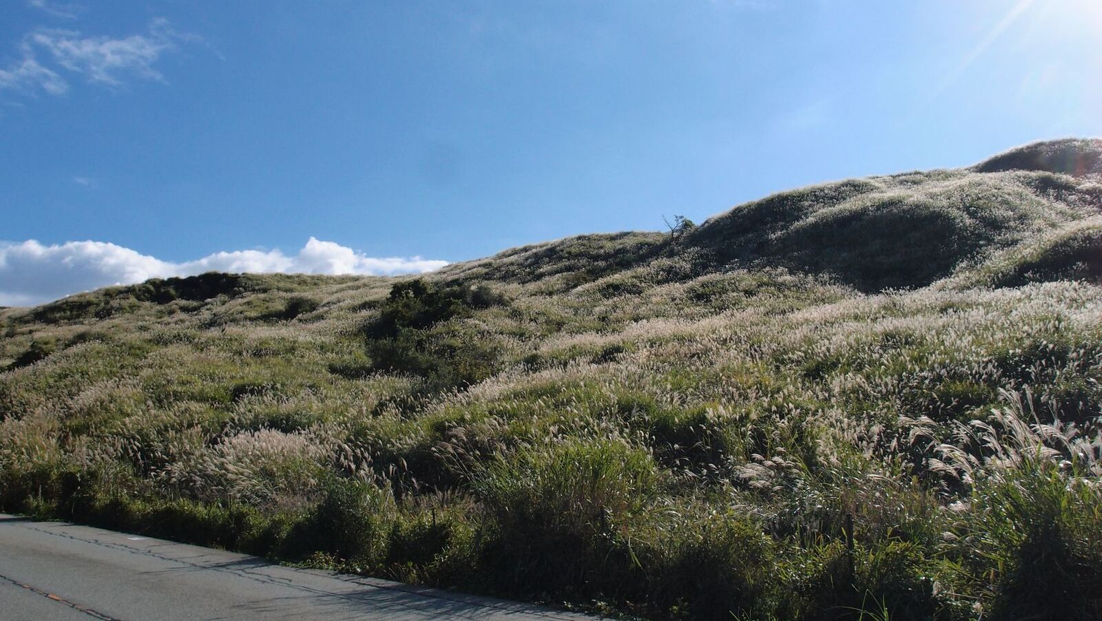 阿蘇山の阿蘇五岳の一部が草原の向こうに頭を出している。