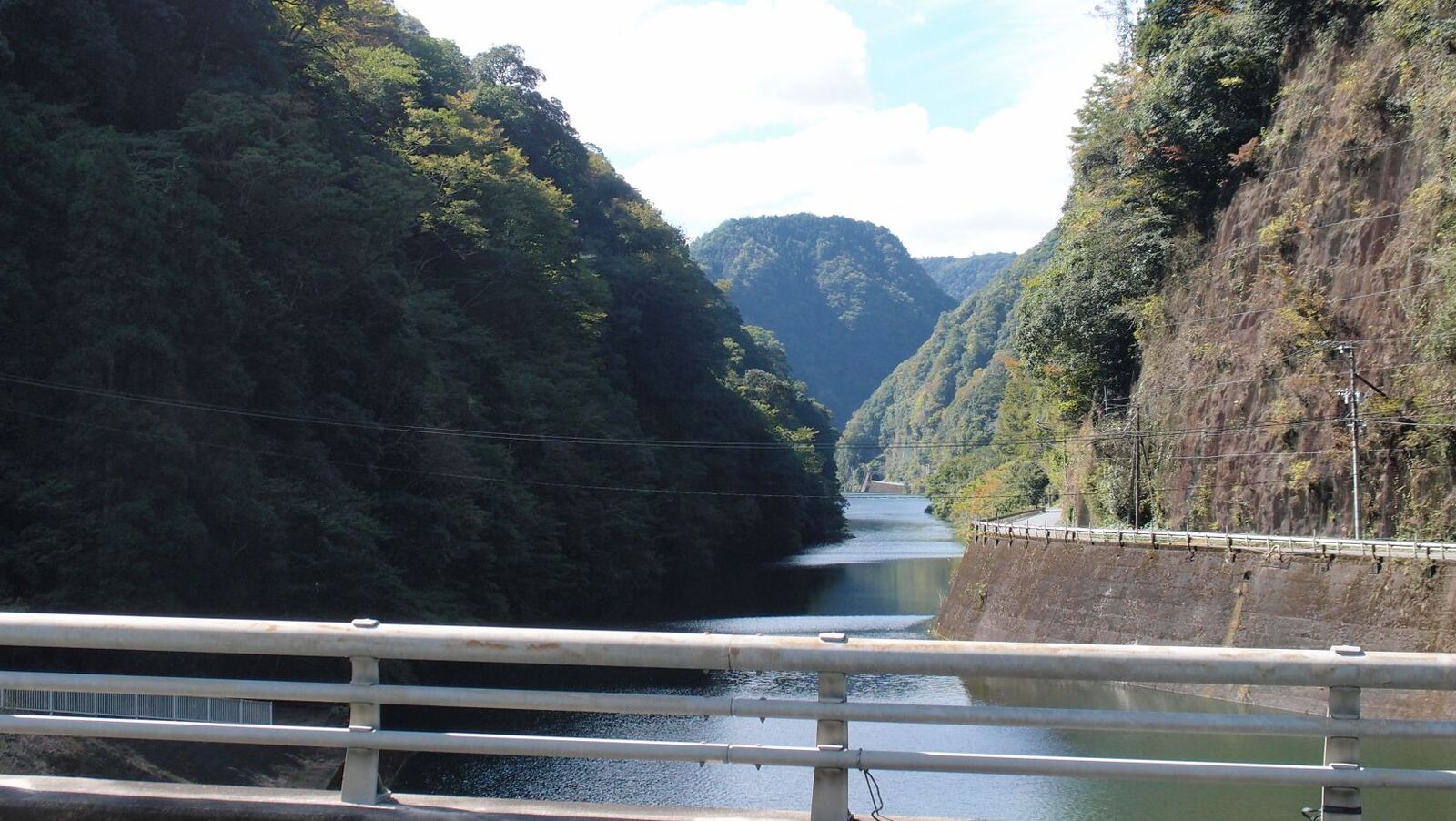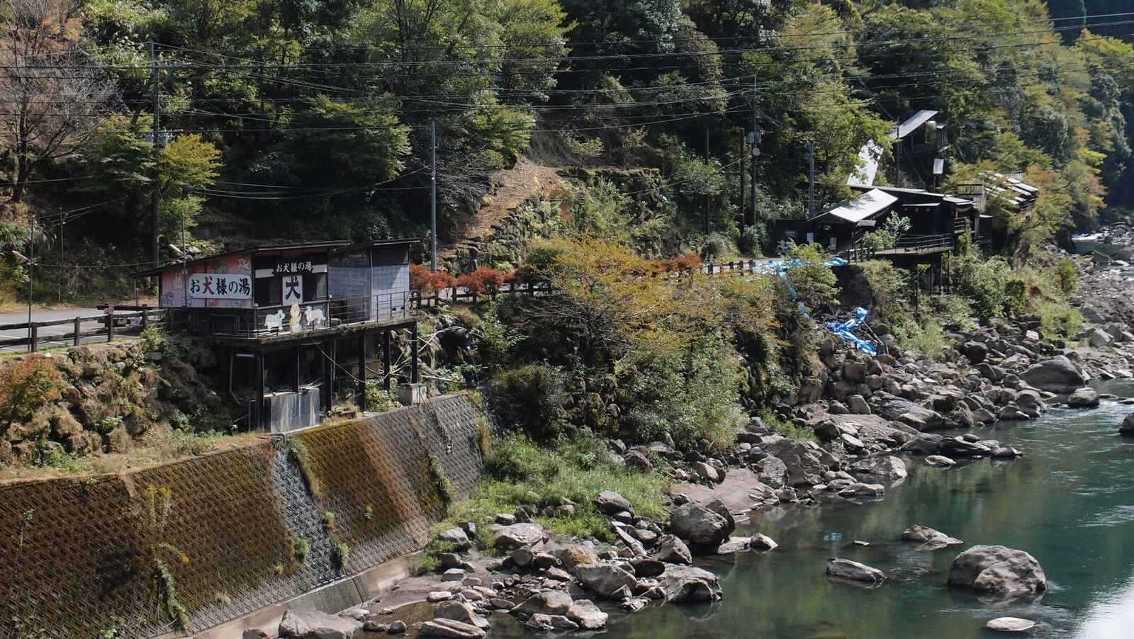 杖立温泉街との分岐点に到着し、右折し大山川を渡る。結構なV字谷。