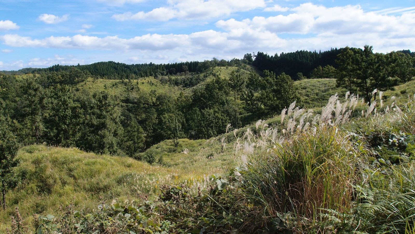 スギ林から脱出すると、高原状になった。ススキが輝いている。